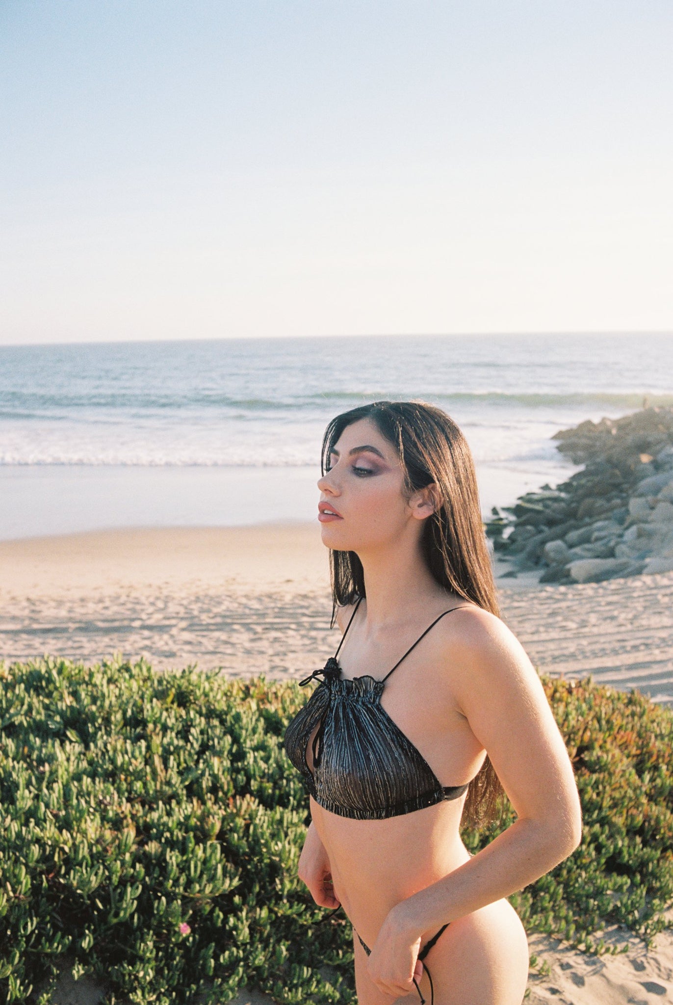 A stunning, one-of-a-kind piece, the Luna bra is made of premium pleated and sparkly tulle, for a very modern yet very chic effect. You can adjust the front ties for a more ruched fit.